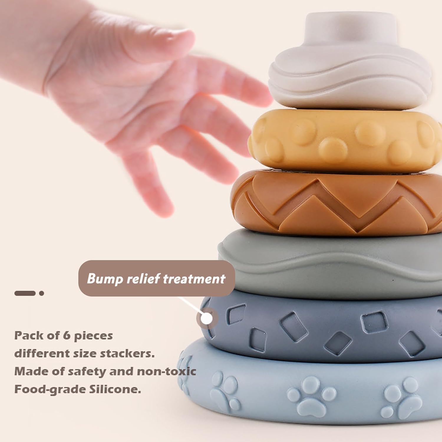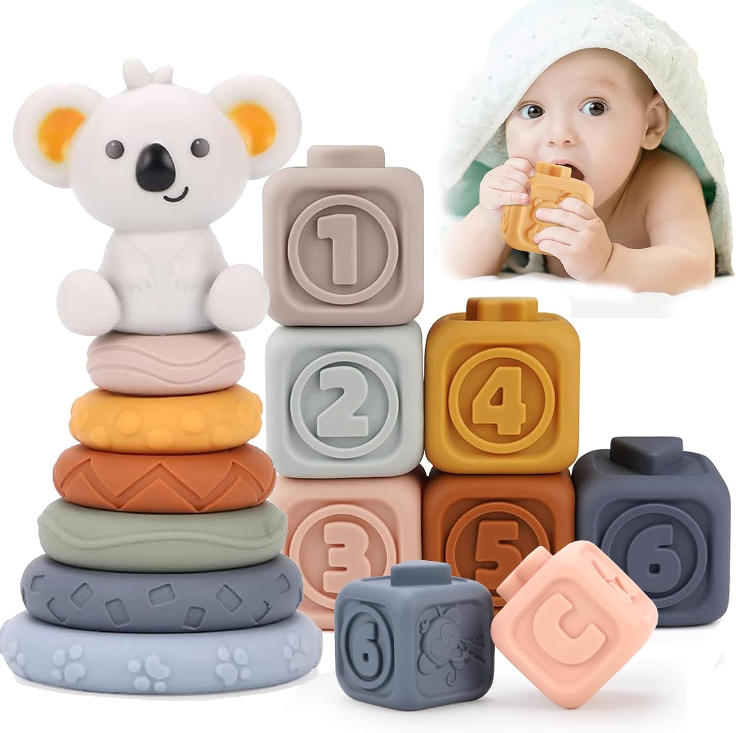 - 【Baby Educational Toys】Baby soft building blocks have embossed animals, shapes, fruits, Arabic numerals and symbols and other designs on the surface. There are also different textures on the stacked rings. Stacking round toys can stack any shape in any order. Help kids develop their sense of touch and improve cognition. Trains baby's fine motor and hand-eye coordination. Great for early childhood development.