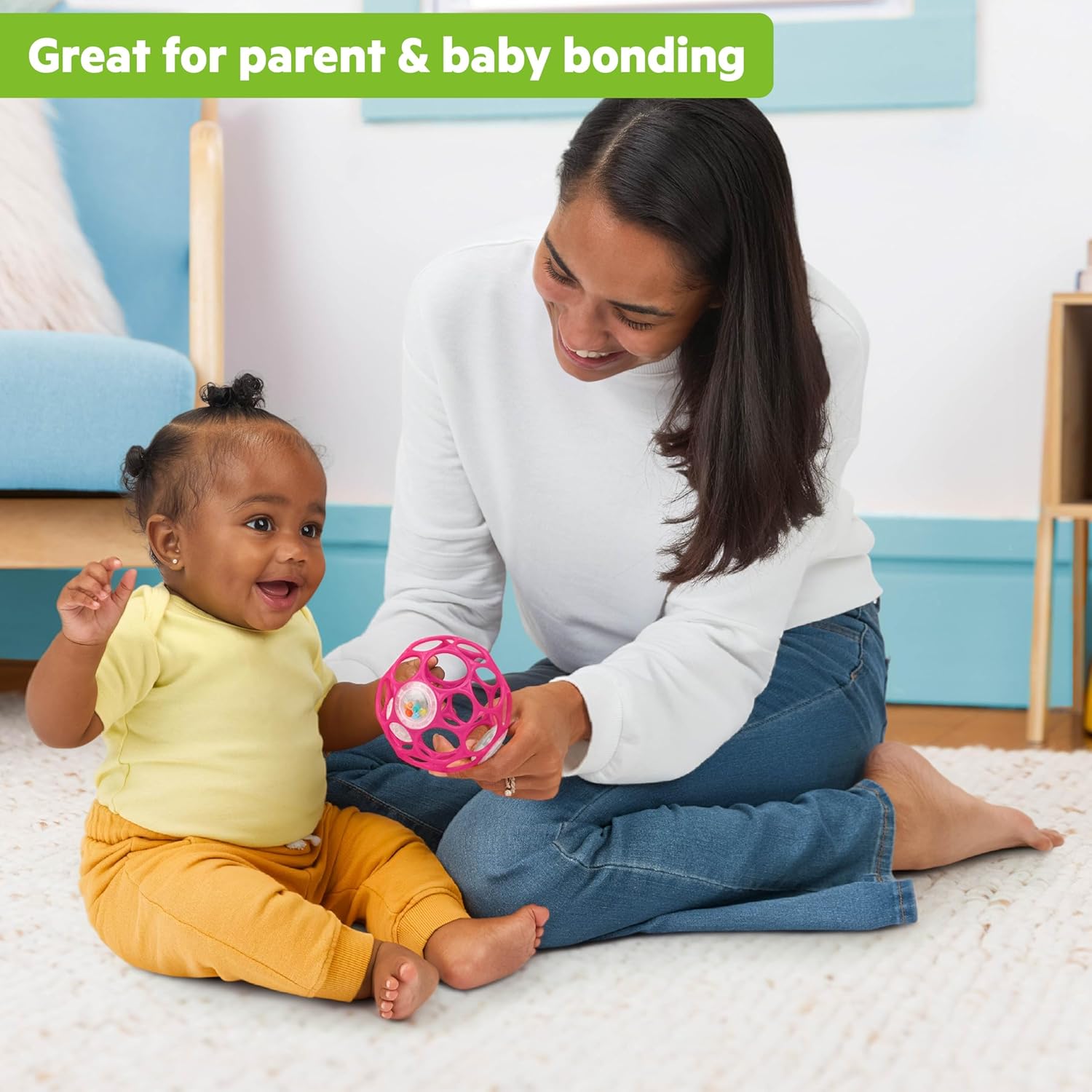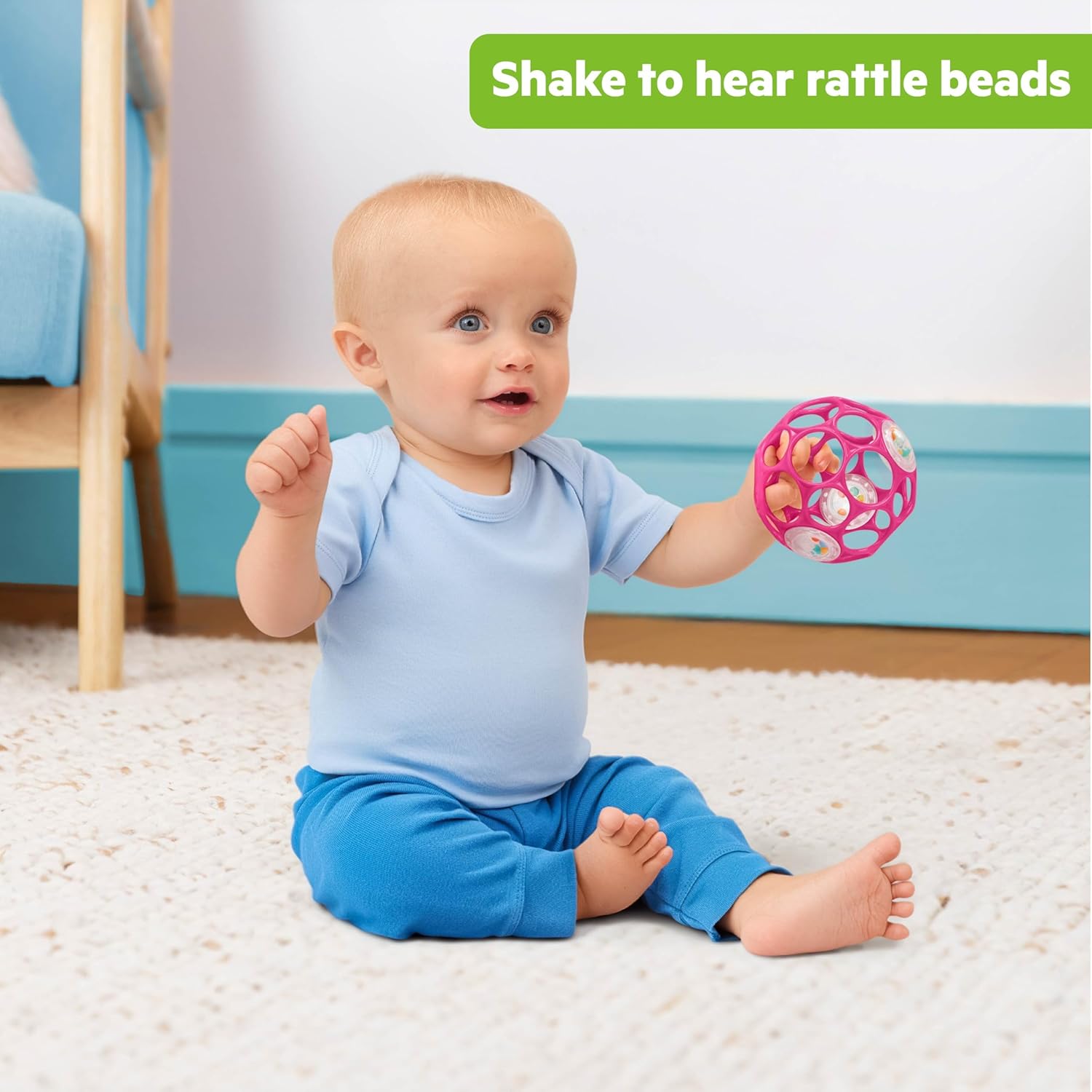 What's got baby all shook up? The easy, squeezy Oball Rattle by Bright Starts! Designed to be easy to grasp for even the littlest fingers, this baby toy encourages the development of fine motor skills with every shake. There are 29 total finger holes, so even inexperienced fingers can hold on tight and shake with everything they've got! Your baby will love watching the bright beads inside each rattle clickity-clack with every shimmy and shake. Toss these award-winning ball rattles into your diaper bag and keep them on hand wherever you go. Your little noisemaker will always have a ball!