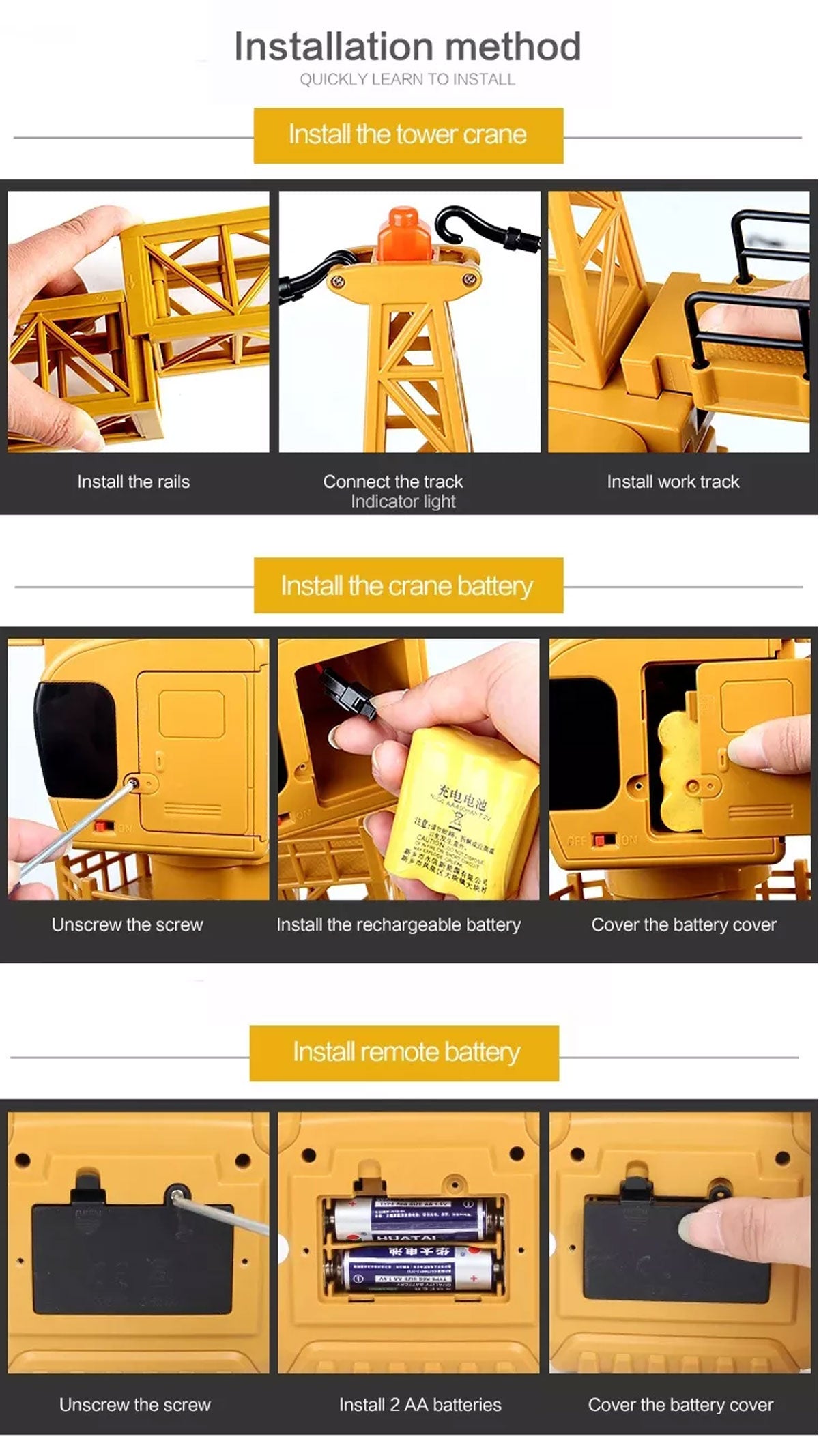 - Remote control: Easily use the remote control, and the child can move the crawler crane to the right or left and raise or lower it. In addition, the construction crane compartment can be rotated on each side - to the right or left.