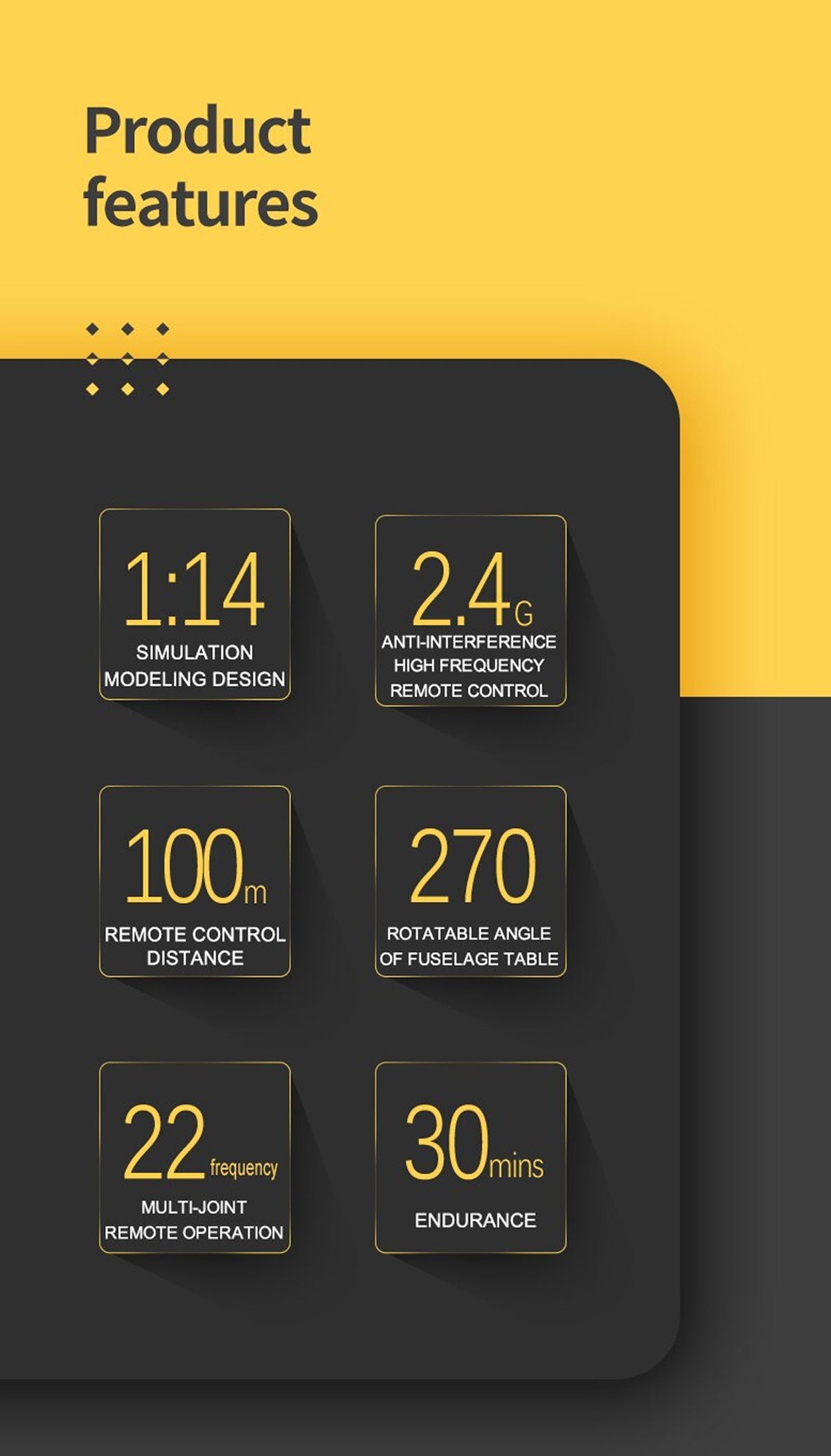 - 30 mins Time. The High-capacity 7.4V 1200mAh intelligent recharable battery yields up to 30mins life time.