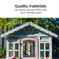 Manufactured with large windows allowing for plenty of natural light to filter in and an easily accessible front door, you will have a complete view of your child’s imaginative cubby house play. Feel at ease knowing Rovo Kids provide round corners around the window sills for added protection during playtime and the cubby house construction is glass-free with non-toxic paint. The weather-resilient roof provides shade during the hot summer days and shelter in the winter.