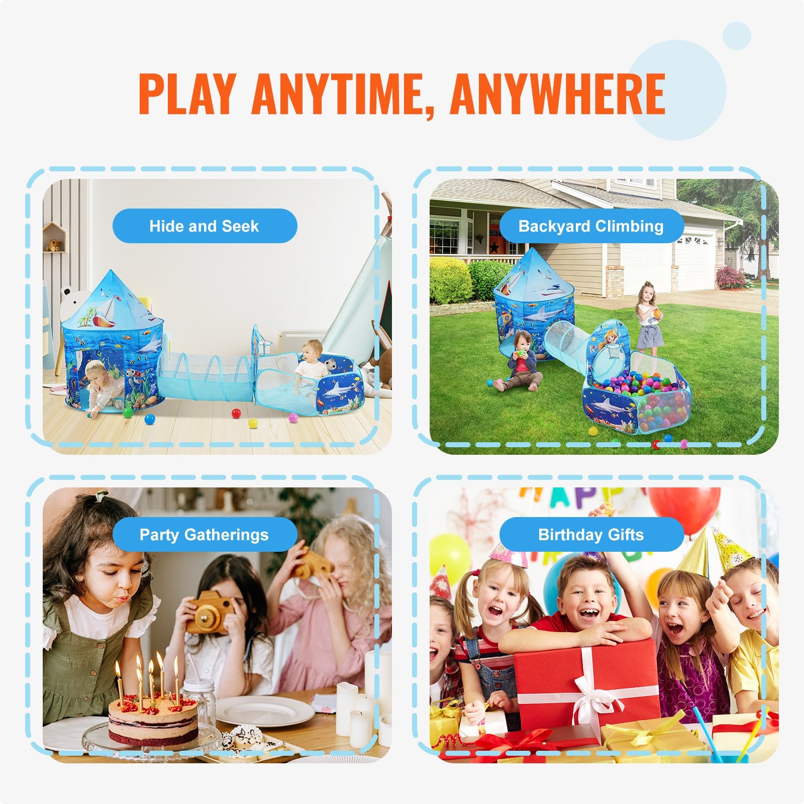 VEVOR 3 in 1 Kids Play Tent with Tunnel, Basketball Hoop for Boys, Girls, Babies and Toddlers, Indoor/Outdoor Pop Up Playhouse with Carrying Bag & Banding Straps Birthday Gifts, Blue Ocean