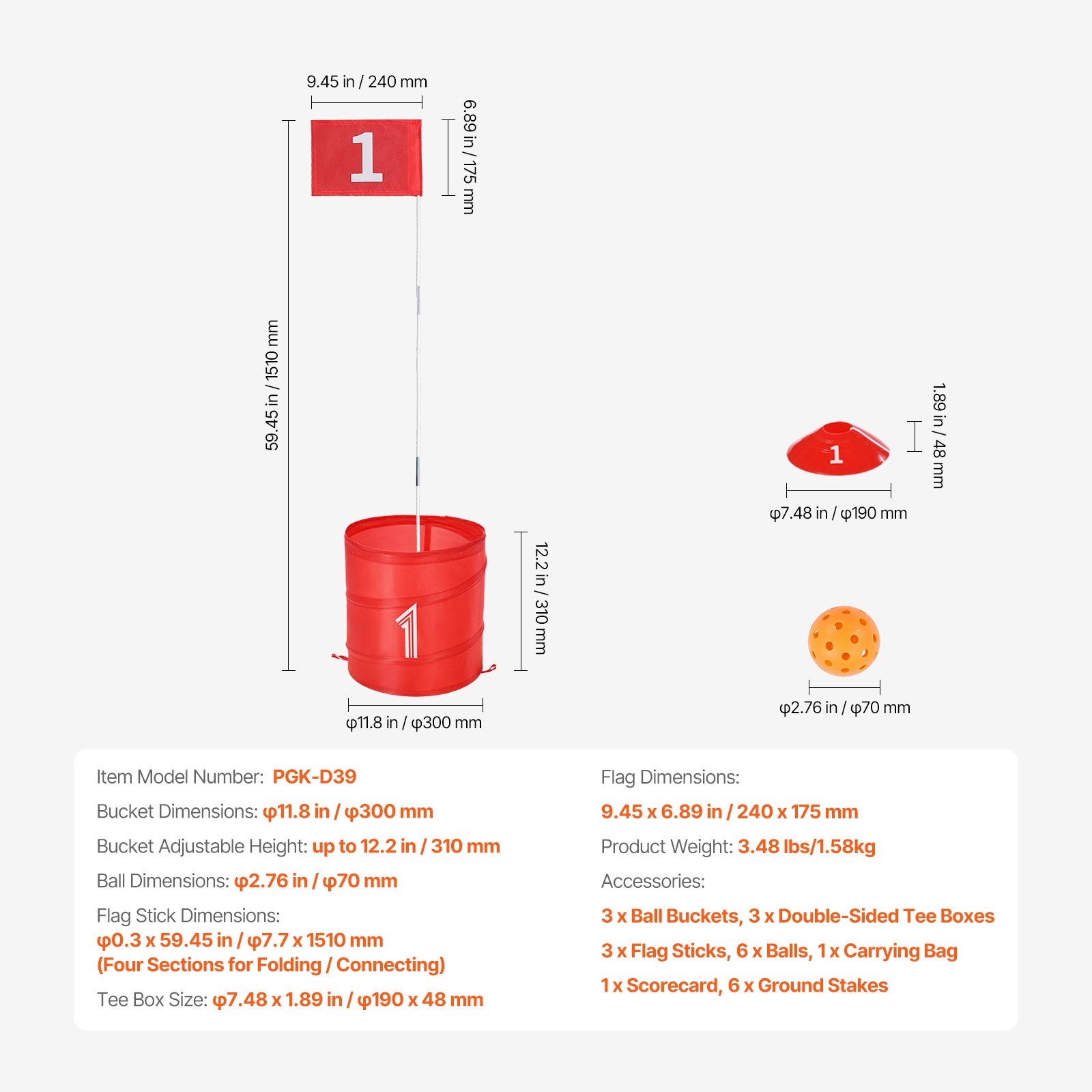 Our golf game with buckets features TPE pickleballs, Oxford cloth buckets, reinforced lock rings with tape and sleeves, fiberglass flag sticks, and corrosion-resistant PE tee boxes. These durable materials ensure long-lasting enjoyment.